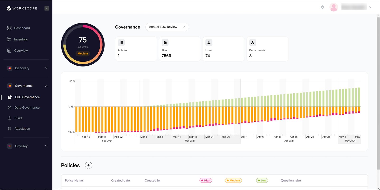 Workscope provides an EUC (End-User Computing) asset management platform that leverages its Discovery, Governance, and Analysis modules to help you identify, manage, and transform your EUC assets and minimise (or even eliminate) the associated operational risk. As part of this capability, it offers continuous discovery and real-time insights. It also incorporates proprietary machine learning and generative AI into several of its capabilities. The platform offers detailed diagnostics on Excel spreadsheets and Access Databases, while its discovery capabilities can also apply to various other types of assets (such as, but not limited to, Python and R files, Alteryx workflows, and PDFs). Notably, sensitive data discovery and classification are available for text-based documents.